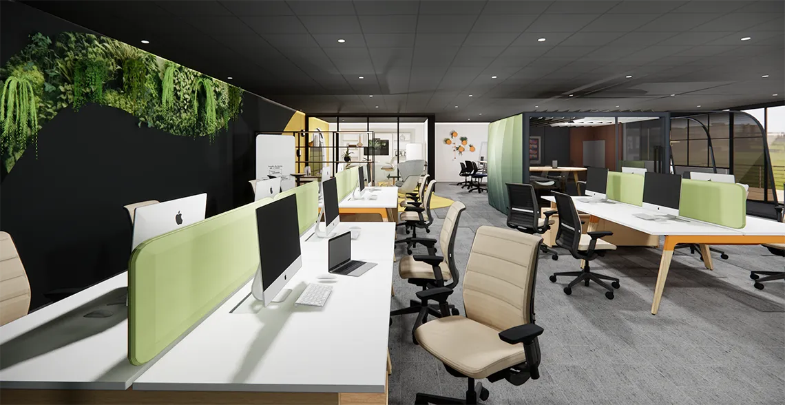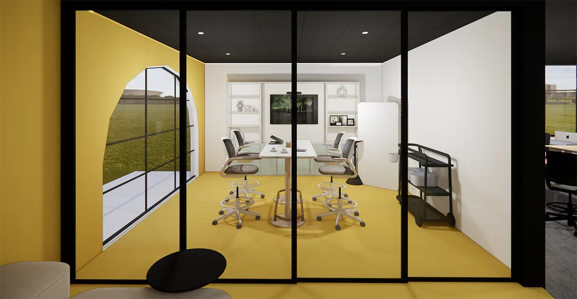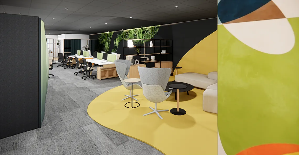 Les couleurs jouent un rôle stratégique dans la conception des espaces. Les teintes dynamiques stimulent la créativité dans les salles de réunion, tandis que des nuances plus douces favorisent la concentration dans l’open space. Cette palette énergétique reflète l’identité visuelle d’EnerGo.