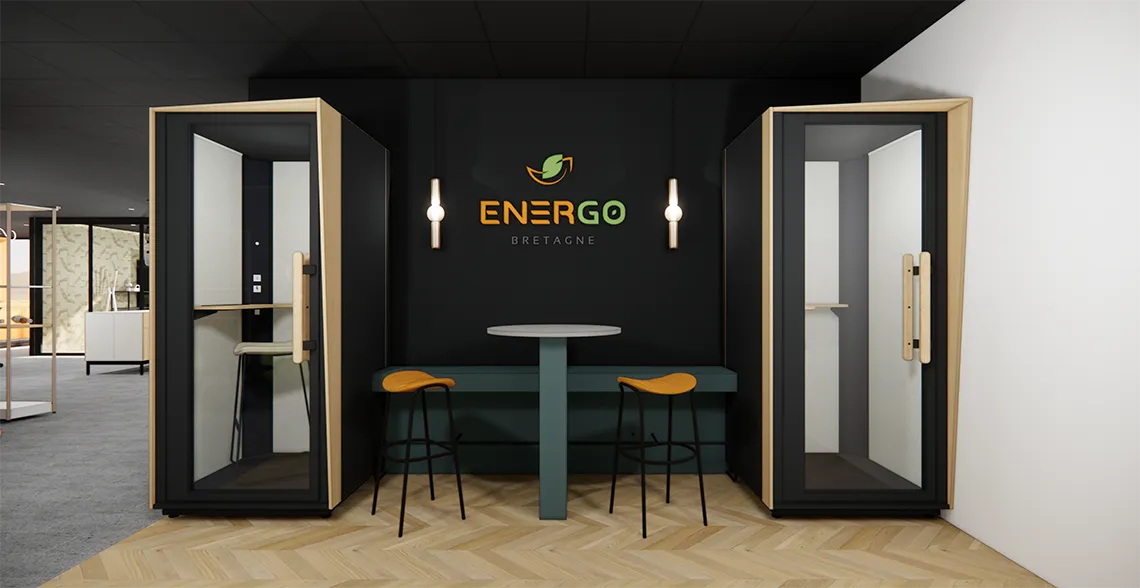 L’identité EnerGo se manifeste dans chaque détail spatial : logo à l’entrée, palette chromatique cohérente, éléments graphiques rappelant l’univers énergétique de la marque. L’espace devient narratif et raconte l’histoire de l’entreprise.